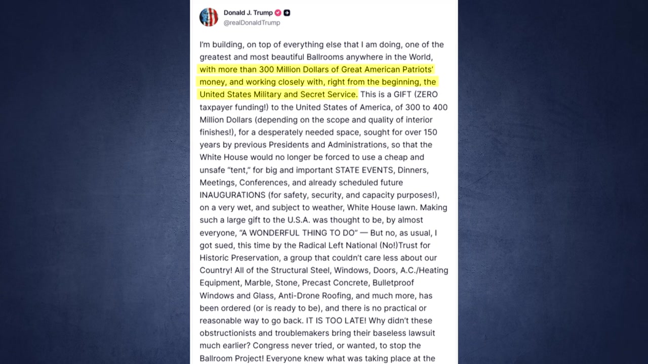 트럼프 대통령은 현지 시간 25일 SNS 트루스소셜에 글을 올리고 "이미 많은 물자가 발주되고 절차가 진행된 지금 시점에 공사를 중단한다면, 백악관은 물론 미국 모든 이해 당사자들에게 치명적일 것"이라고 주장했습니다.