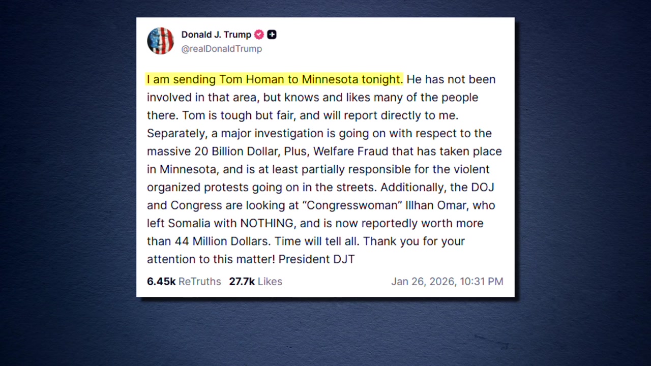 트럼프 대통령은 소셜미디어에 "톰 호먼을 미네소타로 파견한다"며 "호먼은 현지 인사들을 잘 알고 있고 좋아한다"고 적었습니다.