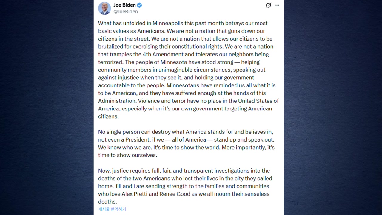 바이든 전 대통령은 현지 시간 27일 엑스에 올린 글에서 "지난 한 달 동안 미니애폴리스에서 벌어진 일은 미국인으로서 우리의 가장 기본적 가치를 배반하는 것"이라고 목소리를 높였습니다.