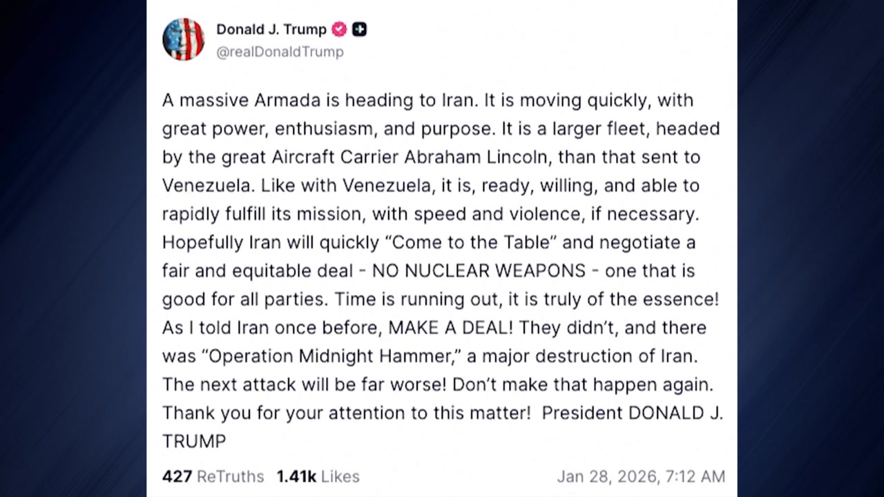 트럼프 대통령은 현지 시간 28일 자신의 SNS인 트루스소셜에 "거대한 함대가 이란으로 향하고 있다"며 "강력한 힘과 열정, 목적을 지니고 신속하게 이동 중이고, 베네수엘라에 보냈던 것보다 더 큰 규모"라고 적었습니다.