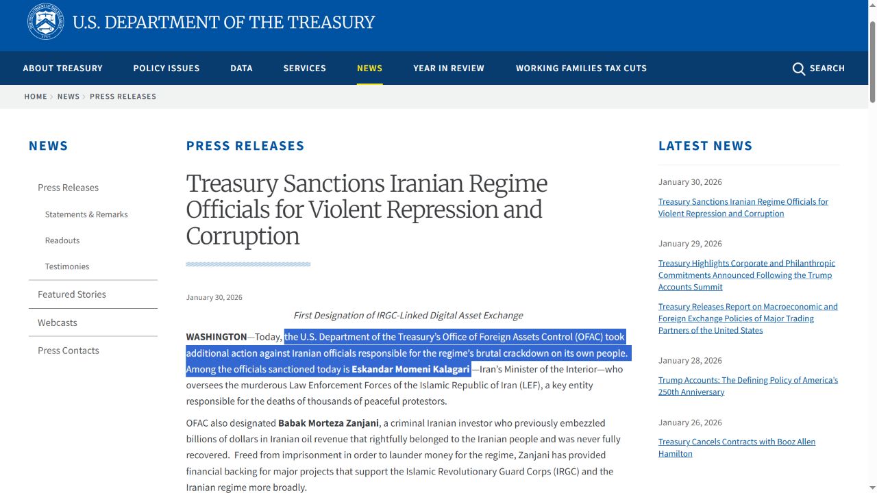 미 재무부 해외자산통제국은 모메니 장관이 평화적으로 시위를 한 수천 명의 사망에 책임이 있는 핵심 기관인 법 집행 군을 총괄한다고 지적했습니다.