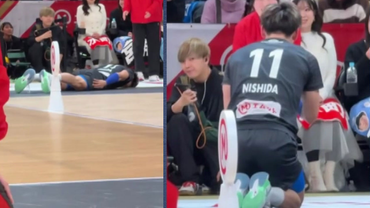 일본 남자 프로배구 올스타전에서 연습하고 있던 니시다 유지 선수가 실수로 여성 스태프를 맞추자 온몸을 날려 사죄한 겁니다.