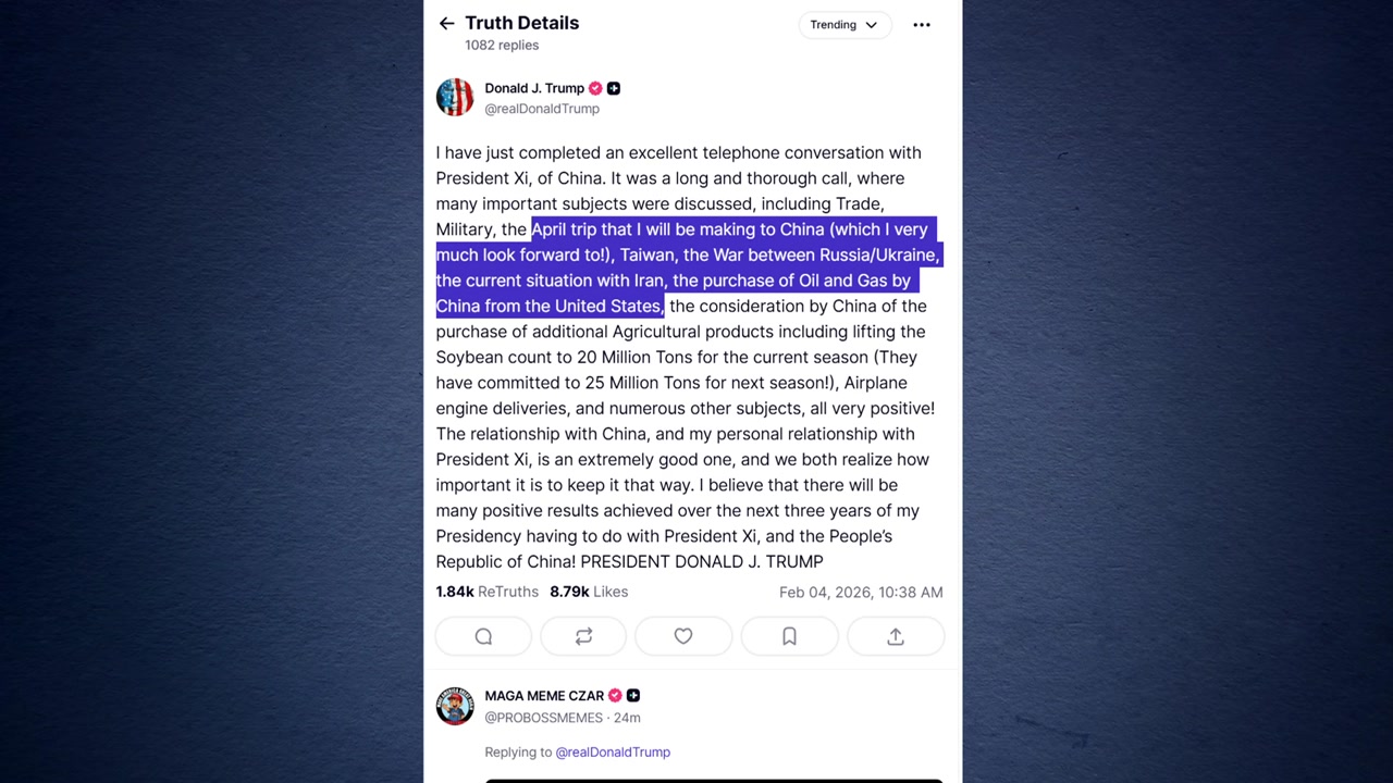 트럼프 대통령이 시진핑 중국 국가주석과의 통화에서 오는 4월 방중 일정을 재확인했다면서 중국의 미국산 석유·가스·대두 구매를 논의했다고 밝혔습니다.