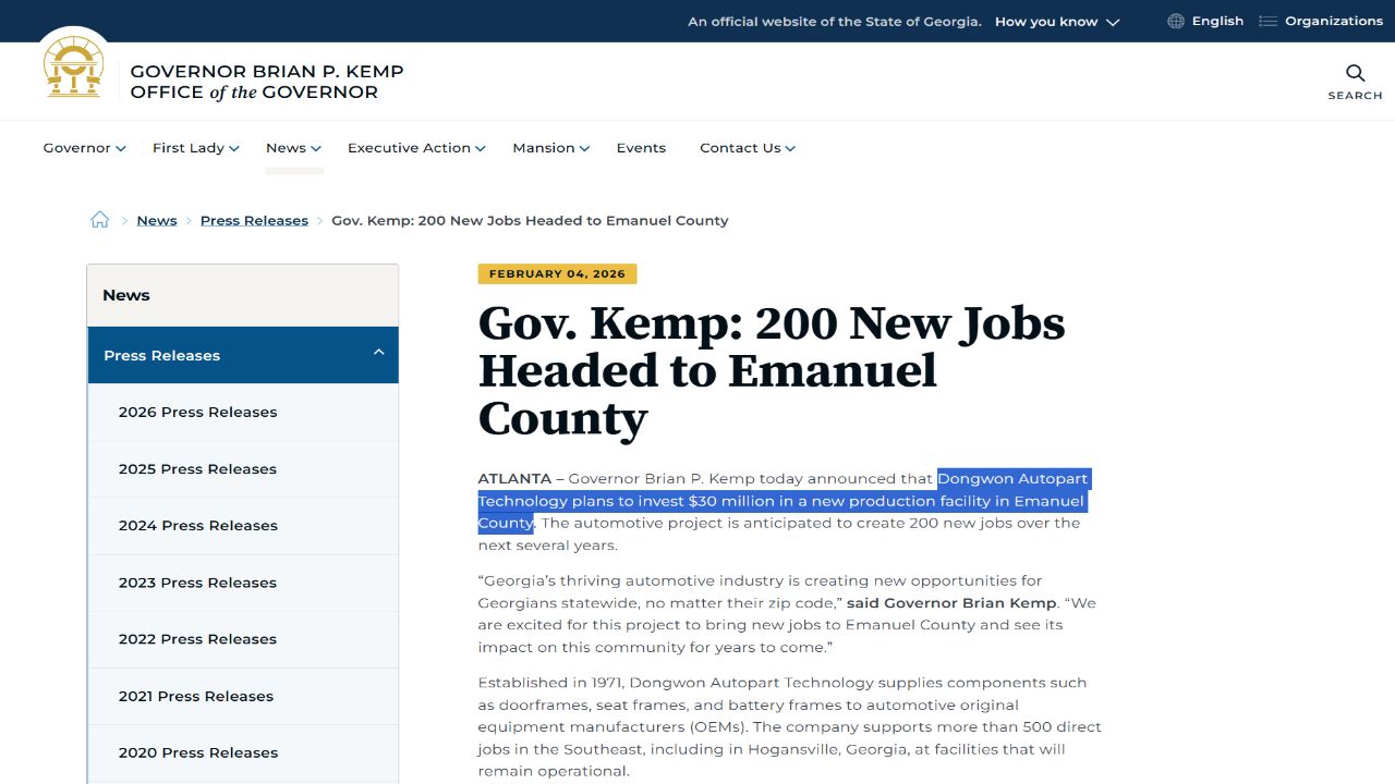 브라이언 켐프 주지사는 "조지아 주의 자동차 산업이 주민들에게 새로운 기회와 일자리를 제공하는 것을 환영한다"고 밝혔습니다.