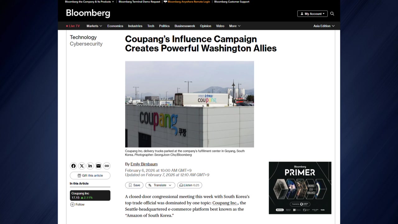 그러면서 이는 미 고위급 인사들에 대한 쿠팡의 로비와 맞물려 나왔다며, 쿠팡이 지난 2년간 최소 550만 달러, 우리 돈 약 70억 원을 들여 워싱턴 정가에 강력한 우군을 확보했다고 짚었습니다.