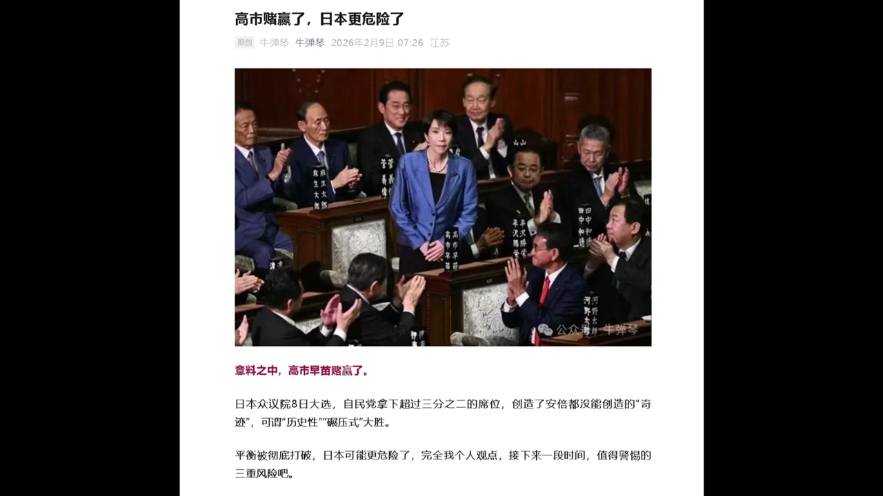 중국 관영 신화통신이 운영하는 소셜미디어(SNS) 계정 뉴탄친(牛弹琴)은 "다카이치 총리가 예상대로 도박에서 이겼다"면서 "정치는 때때로 도박이지만, 국가를 통치하는 건 도박판의 운에 의존할 수 없다"고 평가절하했습니다.