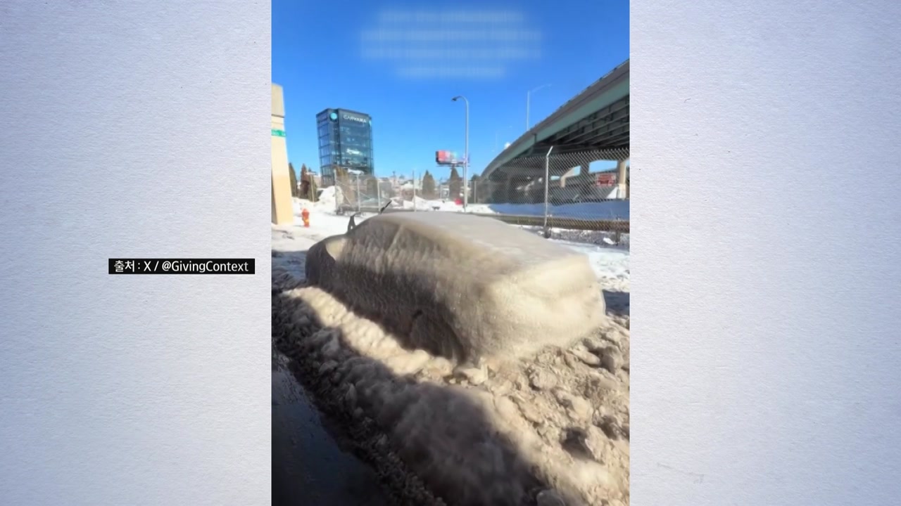 도로에 세워진 자동차가 마치 얼음 조각상처럼 꽁꽁 얼어붙어 있습니다.
