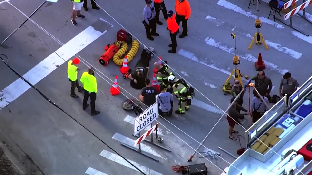 구조 대원들이 도로 한복판에 놓인 배수구를 둘러싼 채 내부를 살펴보고 있는데요,