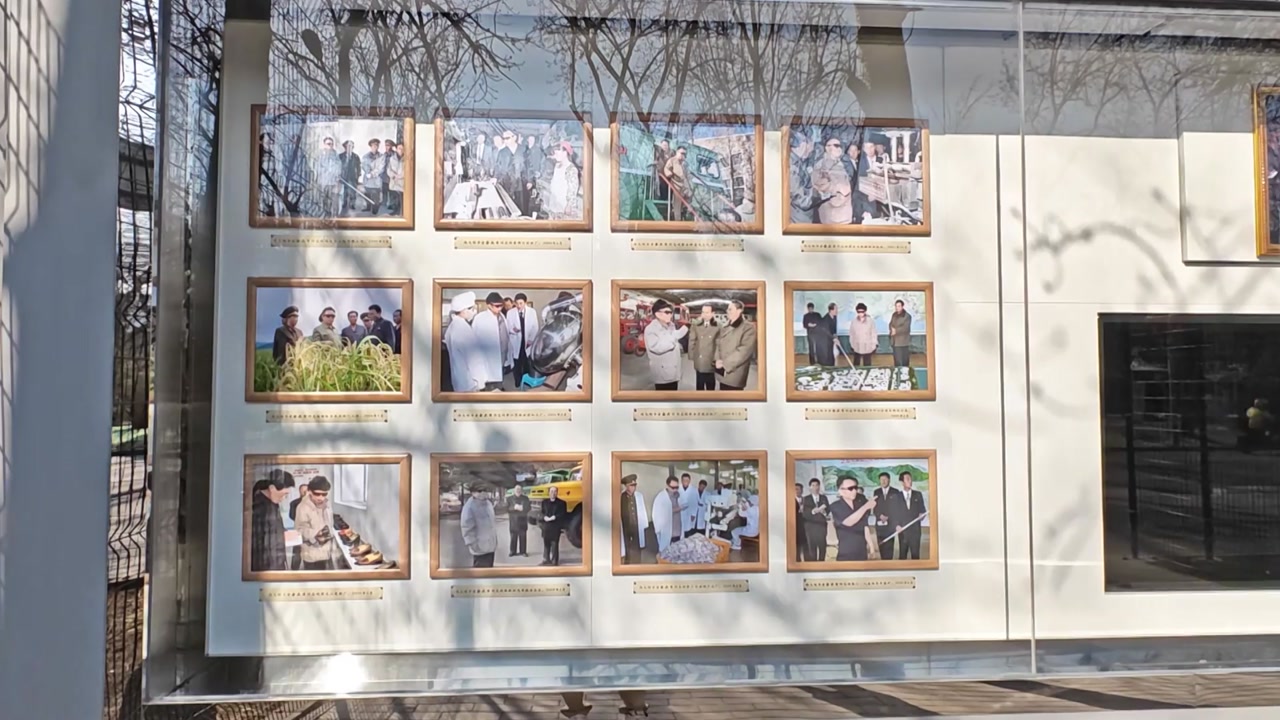 외벽에 설치된 게시판 한가운데 김정은 위원장과 딸 주애가 나란히 서 있는 사진이 걸렸습니다.