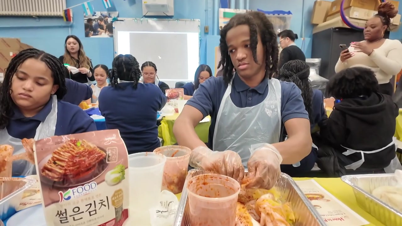 미국 정부가 건강을 위한 권고 식단에 김치를 명시한 가운데 뉴욕 고등학교에선 김치 만들기와 한국 급식 체험 행사가 열려 반응이 뜨거웠습니다.