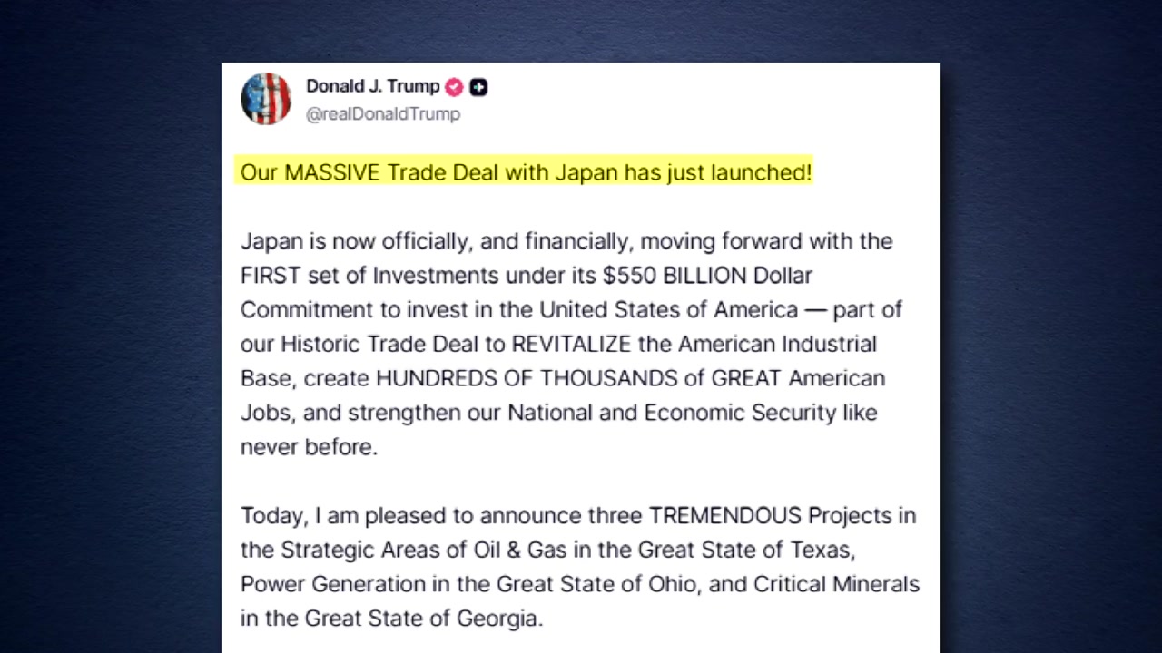 트럼프 대통령이 5,500억 달러 규모의 일본의 대미투자 첫 번째 프로젝트를 발표했습니다.