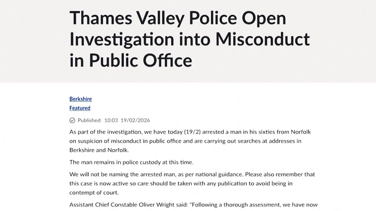 템스밸리 경찰은 현지 시간 19일 오전 찰스 3세 국왕의 사유지인 노퍽 샌드링엄 영지에 있는 앤드루 마운트배튼 윈저의 거처 우드팜을 급습해 공무상 부정행위 혐의로 그를 체포해 구금했습니다.