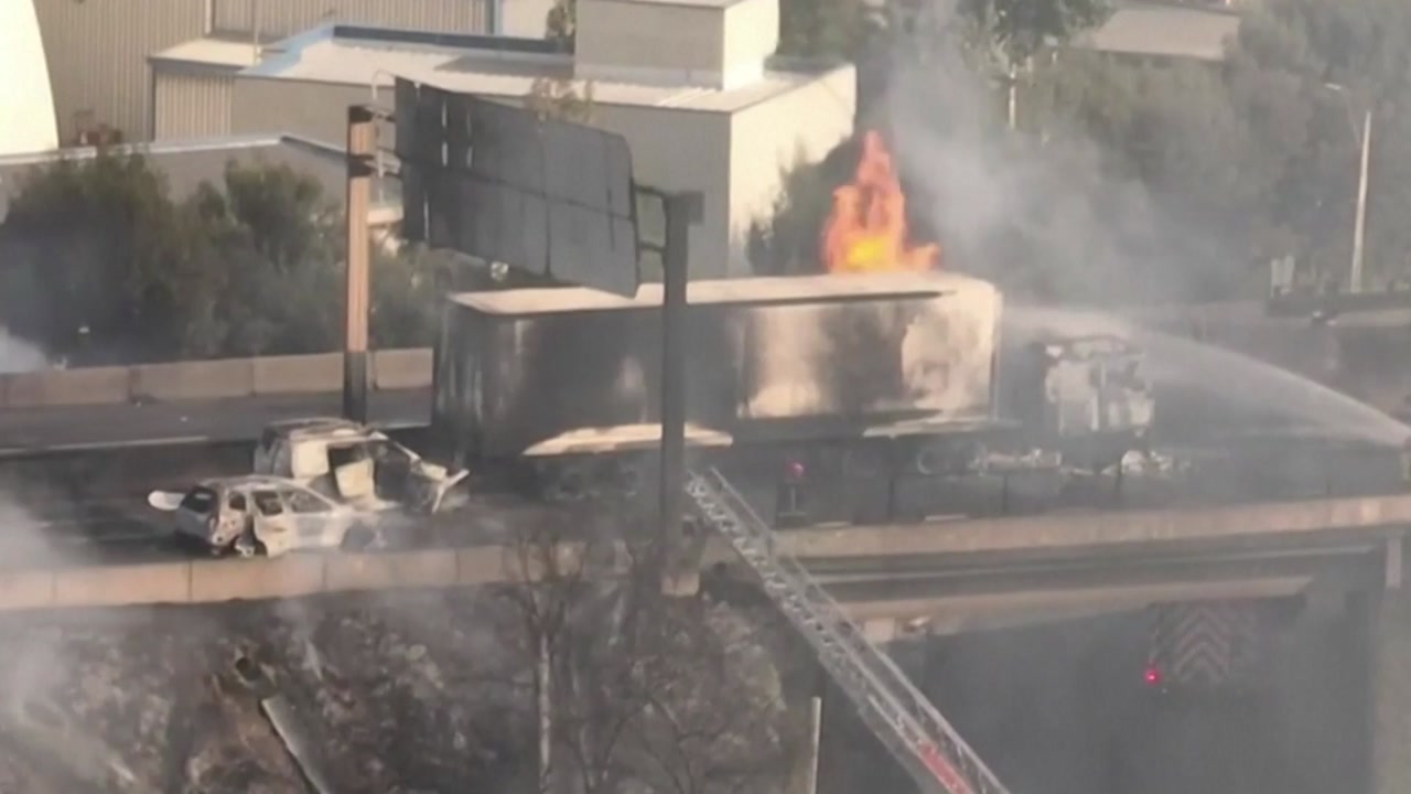 [현장 목격자 : 많은 사람이 (차에) 갇혀 있었고 버스 뒤에 있던 다른 사람들은 창문을 깨기 시작했습니다. 저는 방호벽 뒤에 몸을 숨겼습니다. 보시는 것처럼 차량이 완전히 불에 탔습니다.]