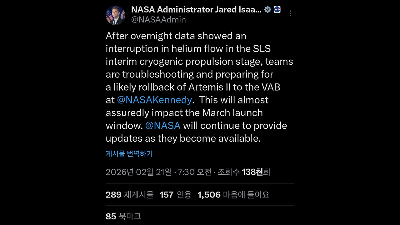 재러드 아이작먼 미국 항공우주국(NASA) 국장은 현지 시간 21일 사회관계망서비스를 통해 "우주 발사 시스템의 중간 극저온 추진 로켓에서 헬륨 흐름에 막힘이 있다는 것이 확인됐다"고 밝혔습니다.