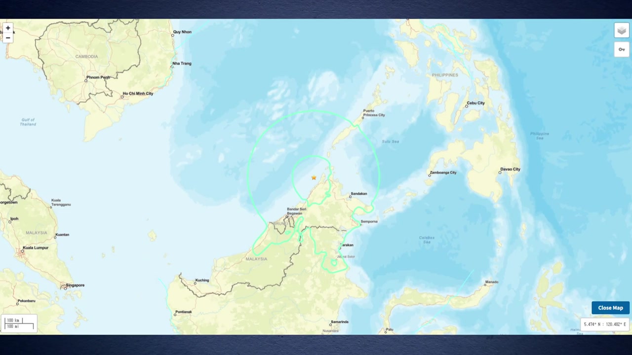미국 지질조사국(USGS)은 코타키나발루로부터 북쪽으로 55km 떨어진 바다에서 지진이 일어났으며, 진원의 깊이는 620km라고 밝혔습니다.