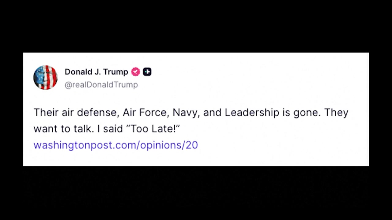 트럼프 대통령은 자신의 SNS 트루스소셜에 "이란의 방공망과 공군, 해군 그리고 지도부는 모두 사라졌다"며 "이란은 대화를 원하지만 너무 늦었다"고 썼습니다.