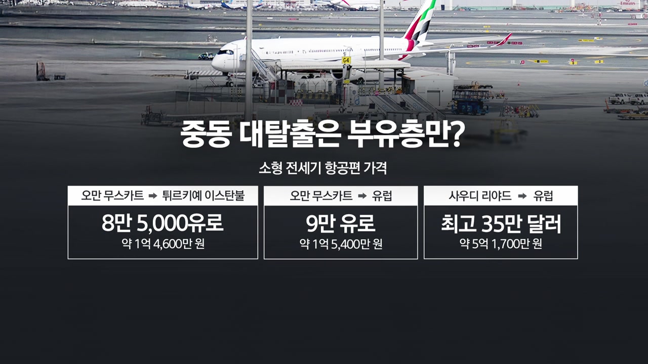 오만에서 튀르키예로 가는 소형 전세기 가격은 평소의 3배인 약 1억4천만 원 수준으로 올랐고 사우디에서 출발하는 유럽행 전세기 가격은 최고 5억 원까지 치솟은 것으로 전해졌습니다.