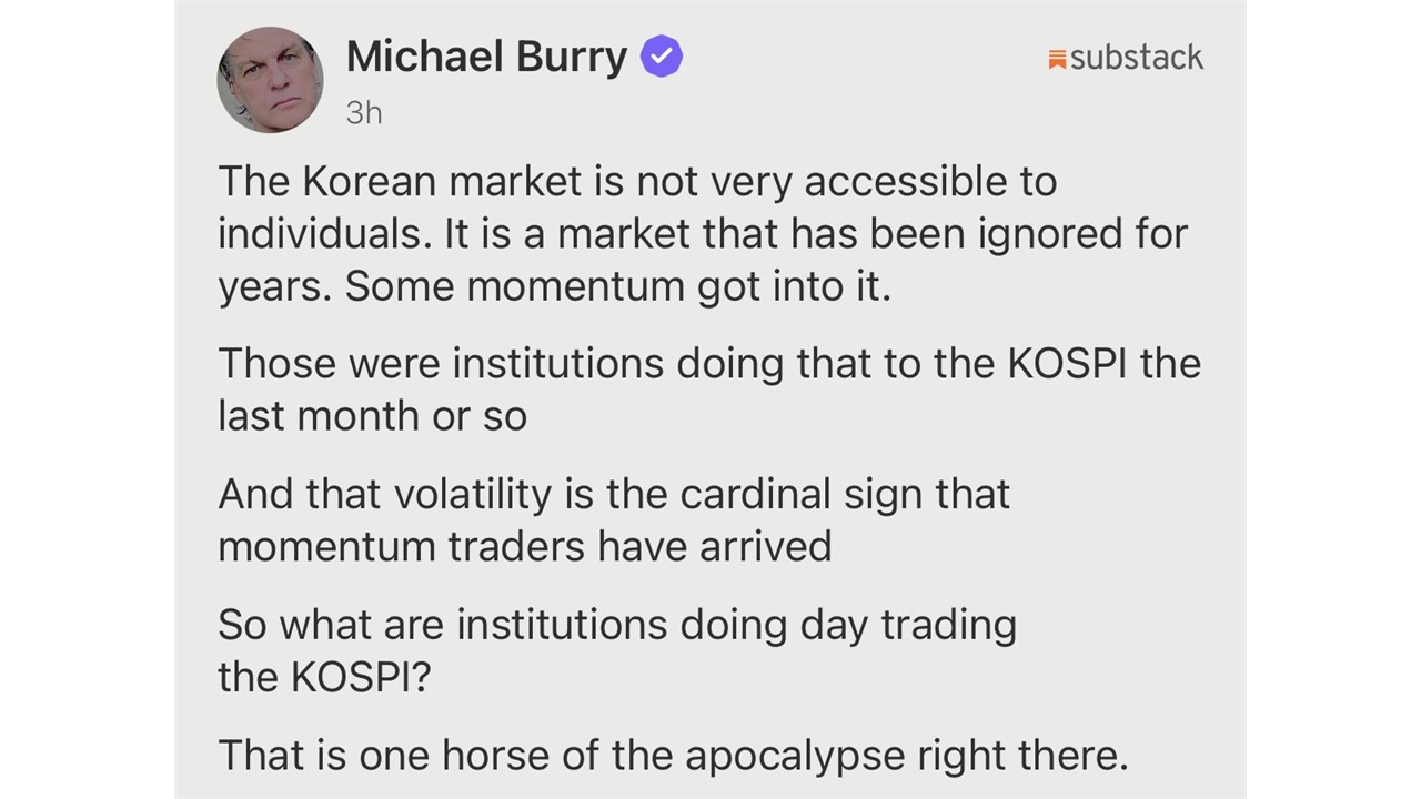 버리는 "기관들이 코스피를 데이트레이딩(당일 매매)한다는 것은 무슨 의미일까"라며 "그것이야말로 묵시록의 네 기사 중 하나(one horse of the apocalypse·종말 징후)가 나타난 것"이라고 썼습니다.