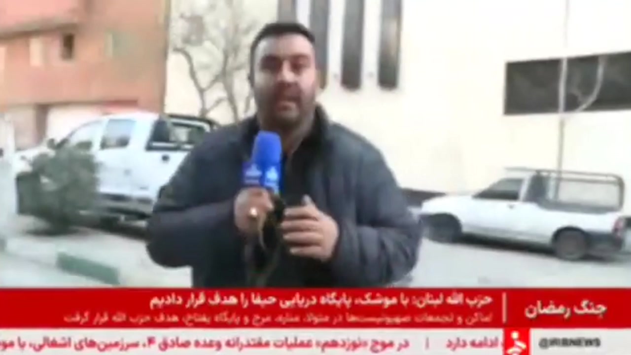 현지시간 6일 아침, 이란 국영 방송 IRIB 소속 기자가 아침 방송에서 수도 테헤란의 폭격 현장 소식을 전하던 중 인근에 미사일이 떨어졌습니다.