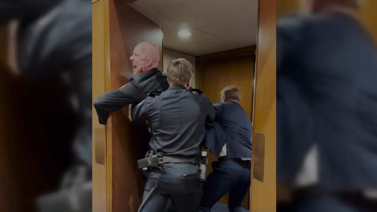 제복을 입고 '전쟁 반대'를 외치던 남성을 의회 경찰이 끌어내는데,