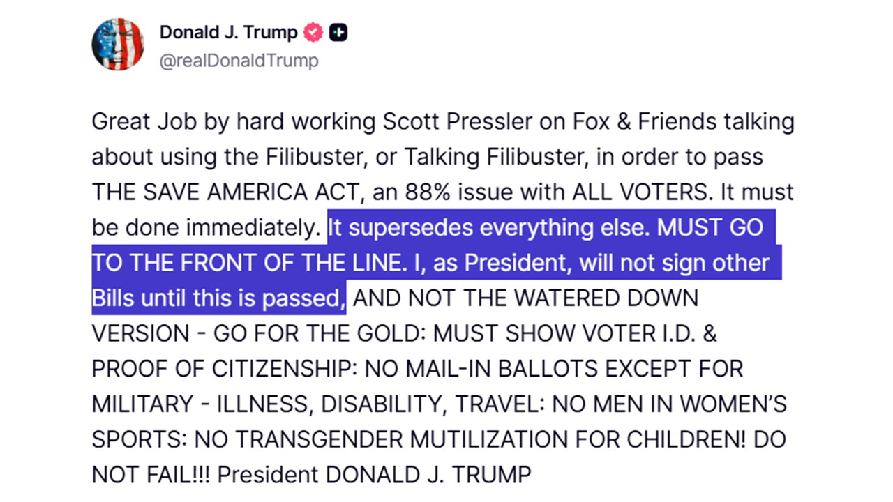 트럼프 대통령은 법안에 포함돼야 하는 내용으로 유권자 신분증 및 시민권 증명 제시 의무, 군 복무·질병·장애·여행을 제외한 우편투표 금지 등 선거 관련 내용을 나열했습니다.