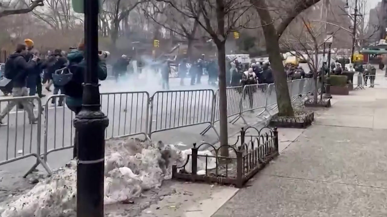 [제시카 티쉬 / 뉴욕시 경찰국장 : 불꽃과 연기가 피어오른 상태에서 경찰관 바로 앞에 떨어졌습니다. 다행히 장벽에 막혀서 피해 없이 꺼졌습니다.]
