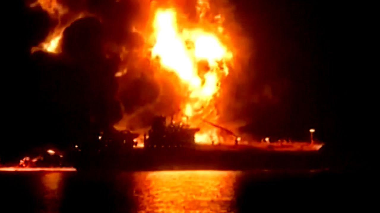 승무원들이 서둘러 몸을 피했지만, 항구에 있던 유조선 2척은 그대로 화염에 잠겼습니다.