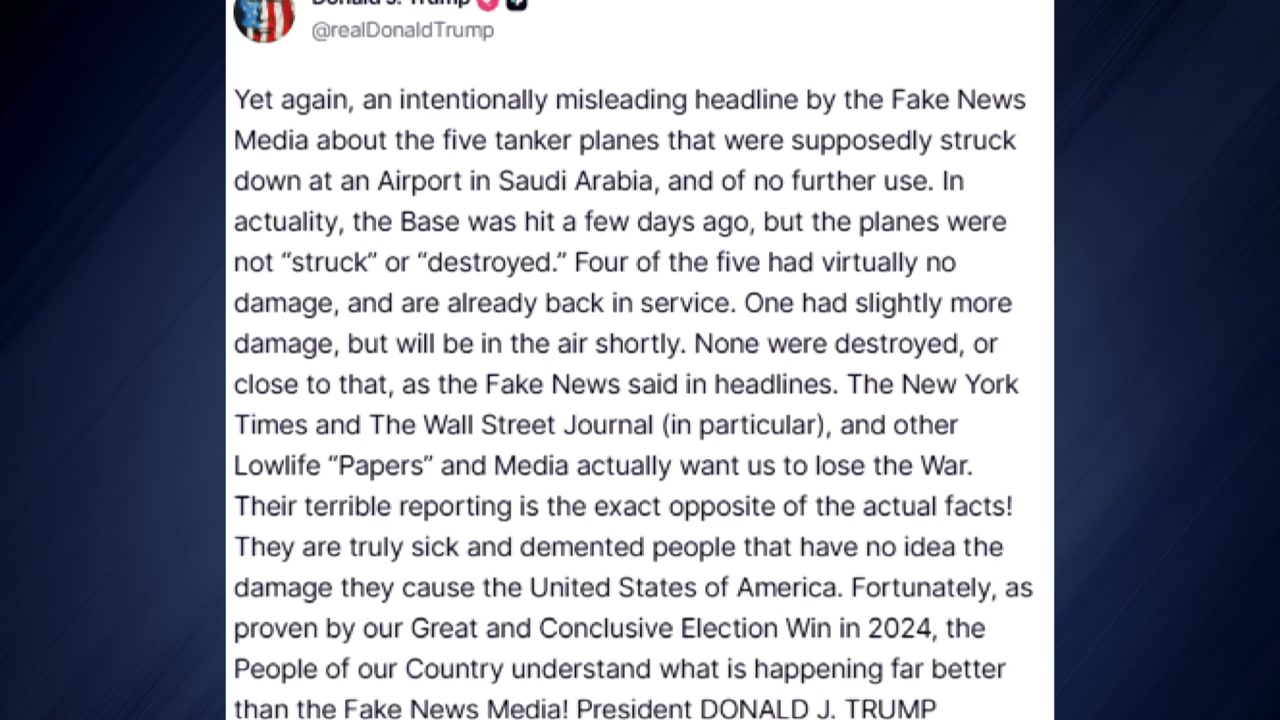 트럼프 미국 대통령은 사우디아라비아에 있는 공군기지에서 미군 공중급유기 5대가 이란의 공격을 받았다는 언론 보도는 왜곡·과장됐다고 반박했습니다.