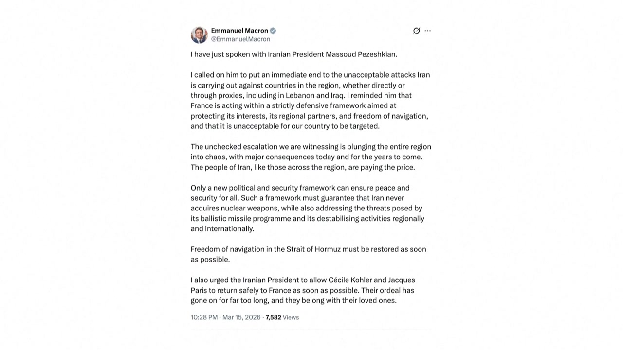 최근 이란 전쟁 여파로 자국군 병사를 잃은 프랑스 에마뉘엘 마크롱 대통령이 현지시간 15일 마수드 페제시키안 이란 대통령과의 통화에서 중동 주변국들에 대한 공격을 즉각 중단하라고 요구했습니다.