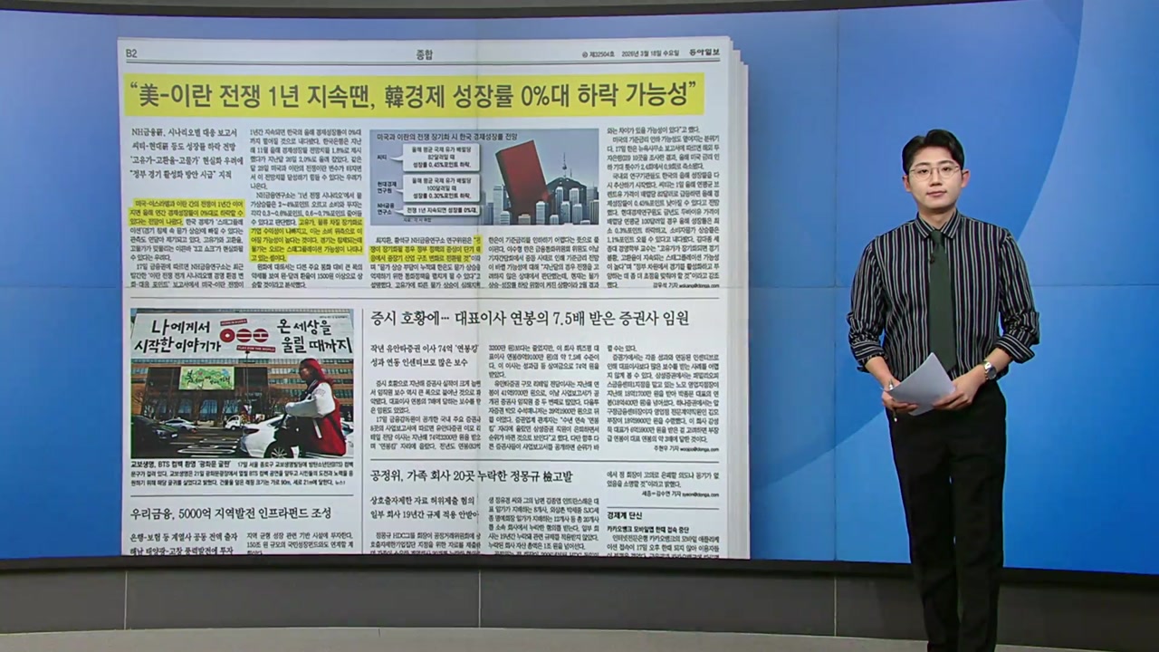 이란 전쟁이 1년간 이어지면 올해 한국 경제 성장률이 0%대로 떨어질 수 있다는 기사부터 보겠습니다.