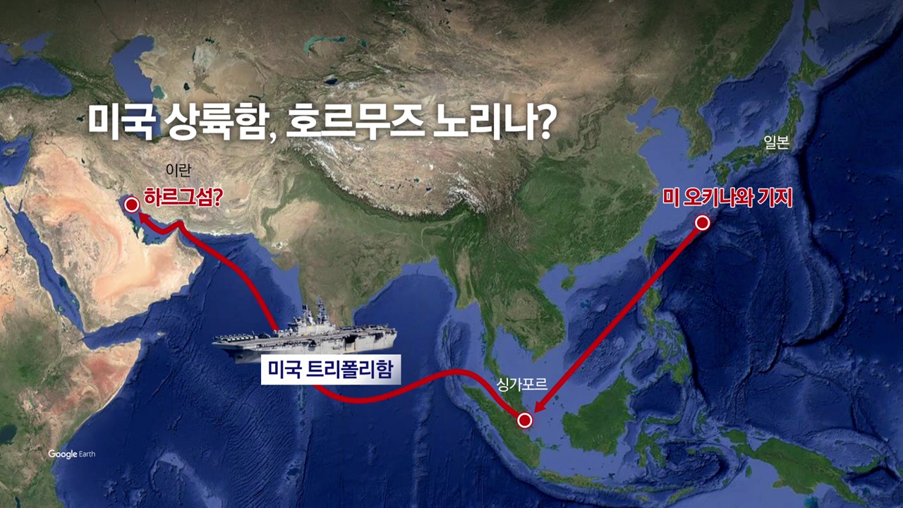 트럼프 대통령은 출구를 찾고 싶어하는데 미 해병대가 호르무즈 해협 쪽으로 향하고 있습니다. 최종 목적지는 어디일까요? 관련 영상부터 보시죠. 해병대원 2500명이 타고 있는데 지금 호르무즈 해협 쪽으로 가고 있거든요. 목적지가 어디라고 보십니까?