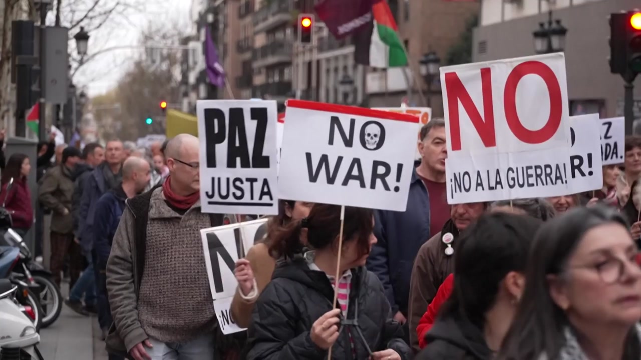 트럼프 미국 대통령과 네타냐후 이스라엘 총리를 '전범'으로 지목한 팻말이 스페인 마드리드에 등장했습니다.