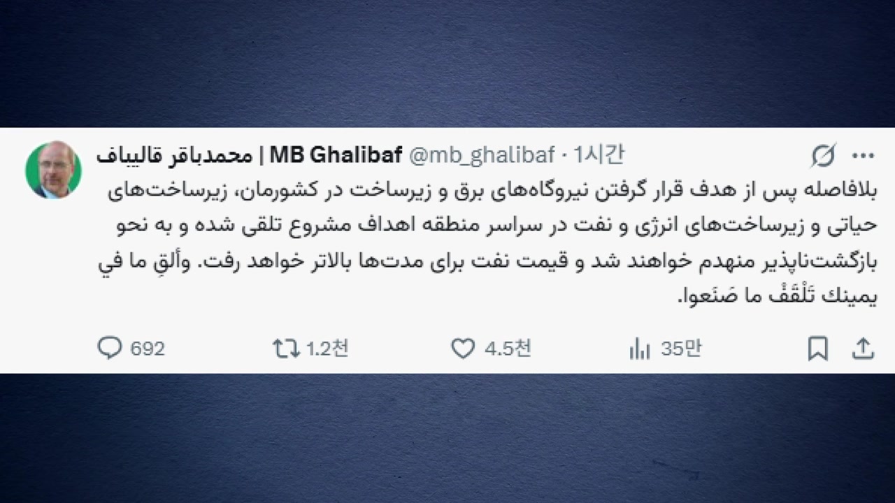 모하마드 갈리바프 이란 의회 의장은 현지 시간 22일 "국가 인프라가 공격받는 즉시 중동 지역 핵심 인프라와 에너지, 석유 시설이 돌이킬 수 없이 파괴될 것"이라고 소셜미디어에 썼습니다.