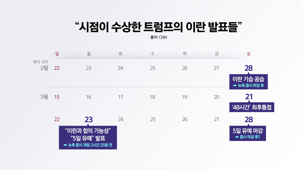 미국 CNN은 이에 대해 [시점이 수상한 트럼프의 이란 발표들]이라는 기사를 실었습니다.