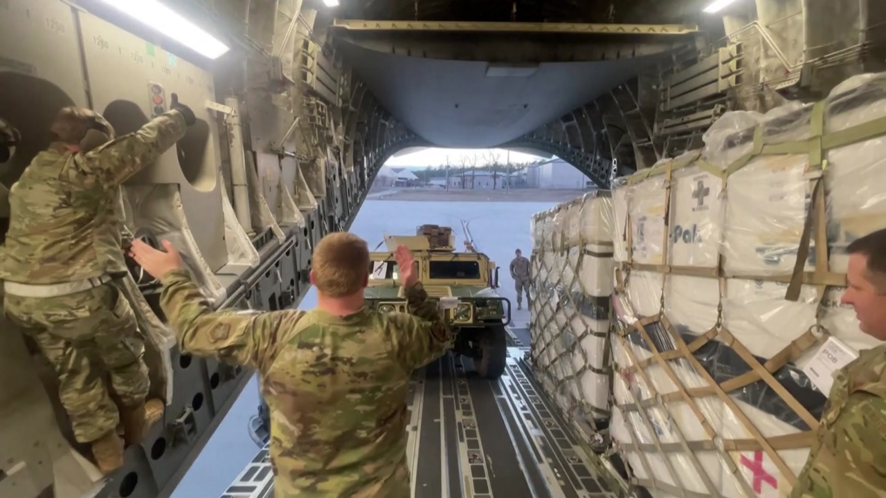 미 공군의 대형 수송기인 C-17 글로브마스터가 아랍에미리트 영공에서 고도를 급격히 낮추고 선회했는데, 이는 전형적인 화물 투하용 비행 형태입니다.