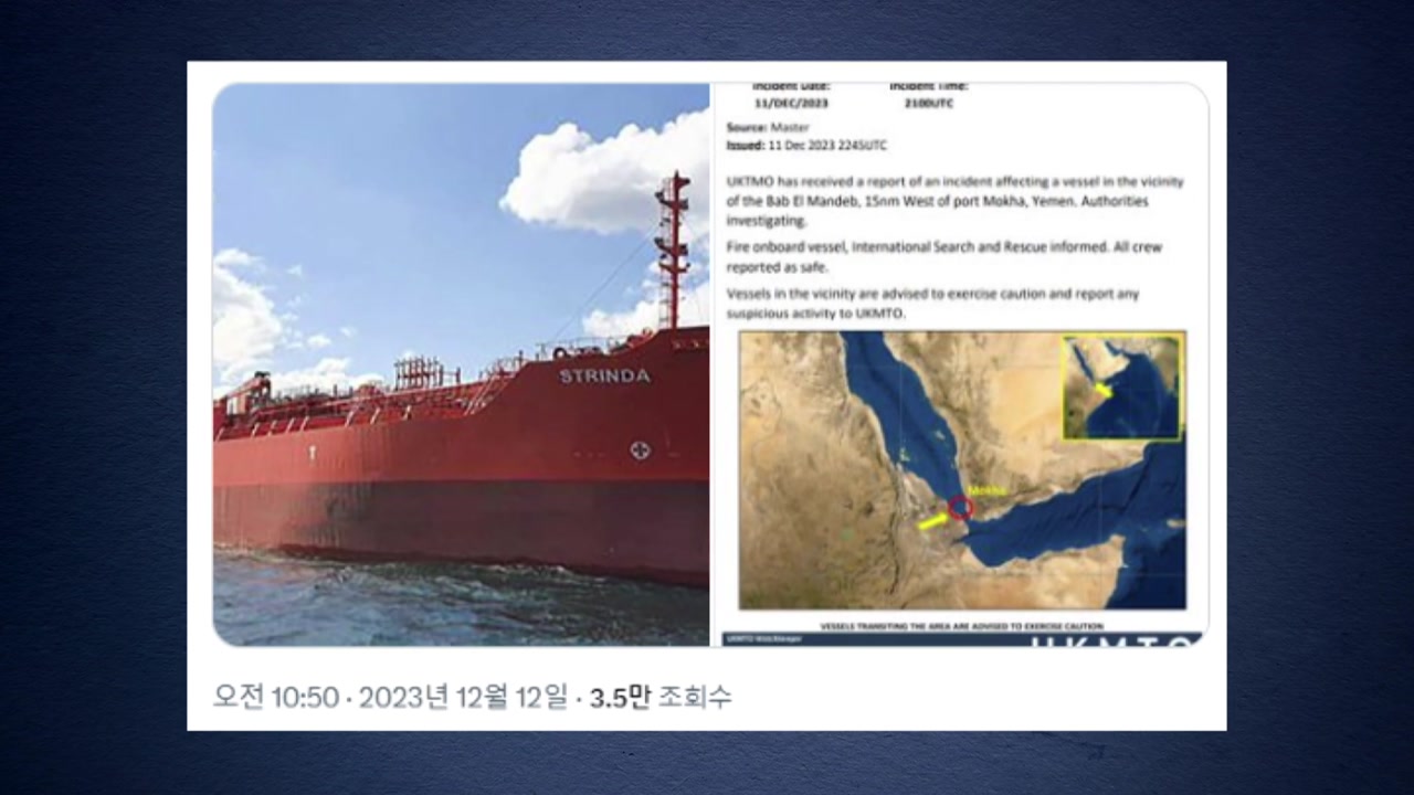 지난 2023년 12월 12일 홍해의 입구인 바브엘만데브 해협을 지나던 노르웨이 선적 유조선이 피격되는 사건이 발생했습니다.