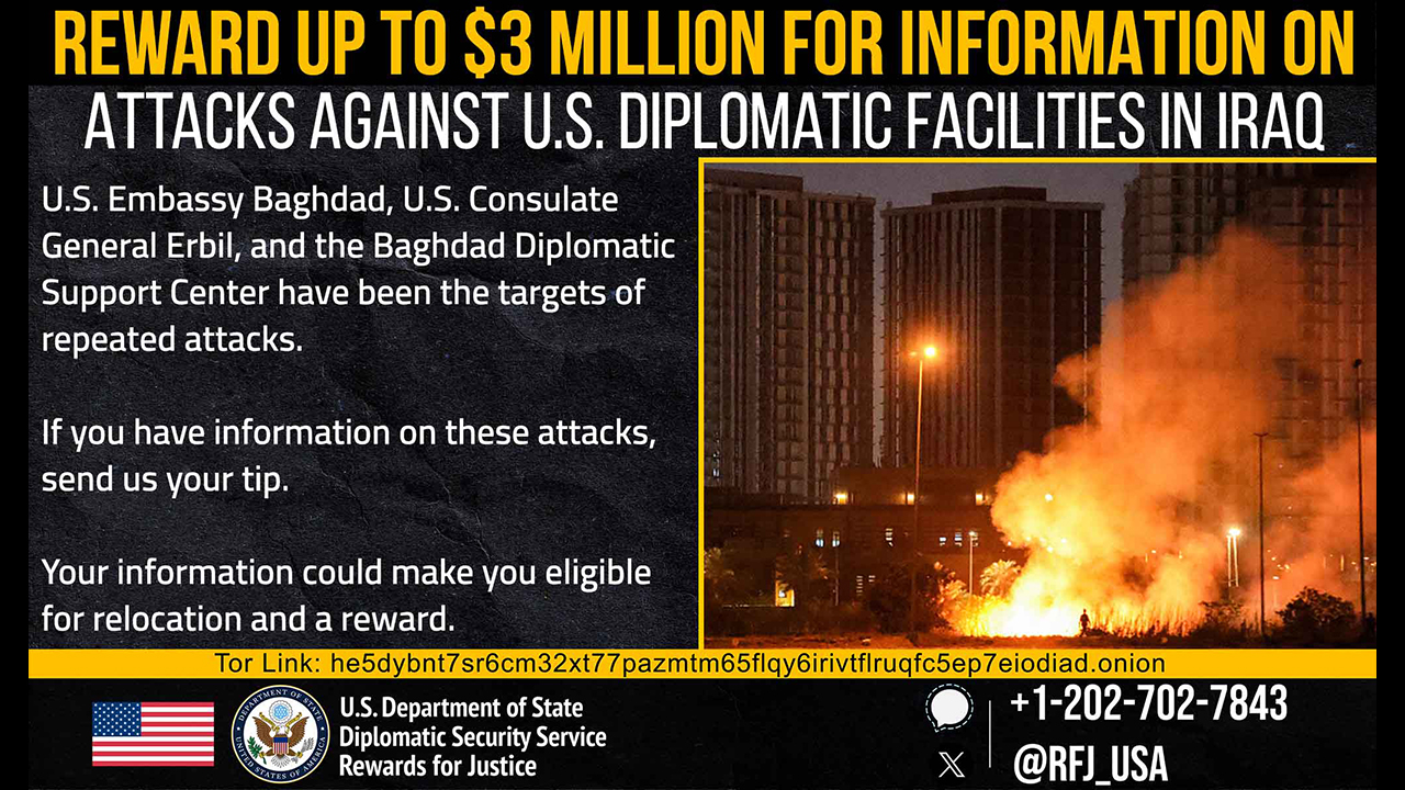 미 국무부의 테러 정보 신고·보상 프로그램인 '정의에 대한 보상'은 엑스 계정을 통해 "바그다드와 다른 지역의 미 대사관을 겨냥한 테러 공격을 막는 데 도움을 달라"고 밝혔습니다.