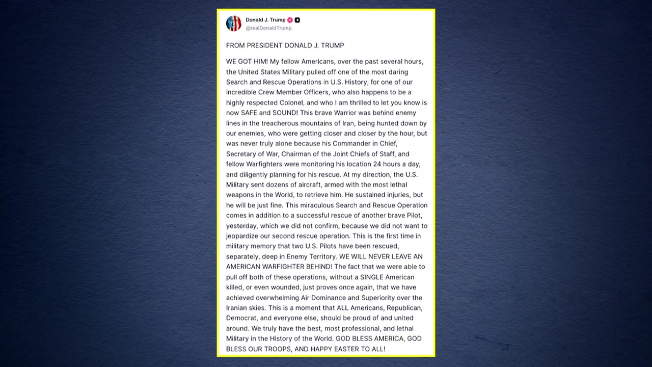 도널드 트럼프 미국 대통령은 구조 소식이 전해진 직후 소셜미디어에 "미군은 역사상 가장 대담한 구조 작전을 완수했다"며 "실종자가 무사히 돌아왔다는 소식을 알리게 되어 매우 기쁘다"고 적었습니다.