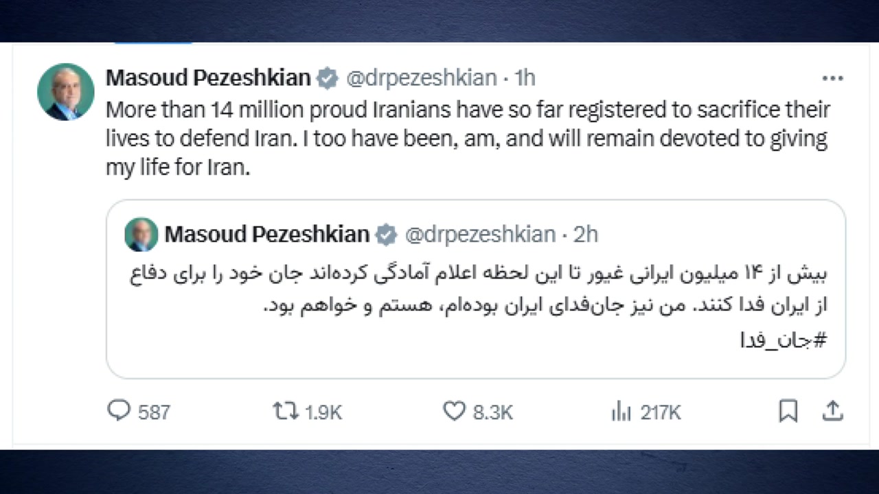 마수드 페제시키안 이란 대통령은 현지 시간 7일 자신의 SNS에 지금까지 천4백만 명 이상의 이란인이 나라를 지키기 위해 목숨을 바칠 준비가 되었음을 선언했다고 남겼습니다.