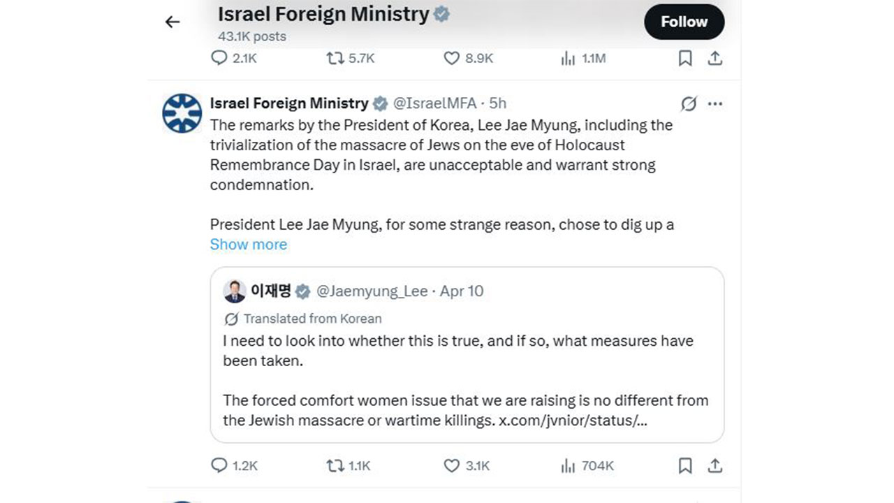 이스라엘 외무부는 오늘(11일) X에 올린 글에서 "이재명 한국 대통령의 발언, 특히 이스라엘 홀로코스트 추모일을 앞두고 발생한 유대인 학살 사건을 경시하는 듯한 발언을 했는데, 이는 용납할 수 없으며 강력한 규탄을 받을 만하다"고 밝혔습니다.