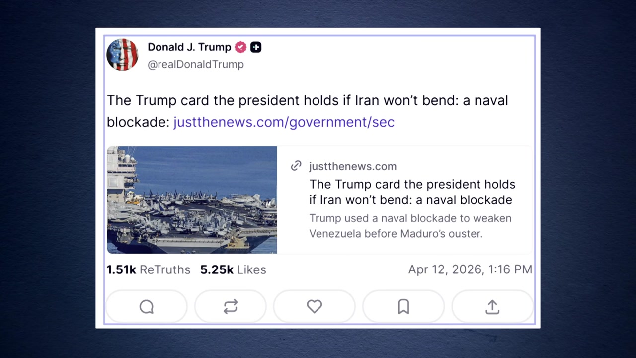 트럼프 대통령은 현지 시간 12일 협상이 결렬된 뒤 SNS 트루스소셜에 '이란이 굽히지 않을 경우 대통령이 보유한 카드는 해상 봉쇄'라는 제목의 기사를 올렸습니다.