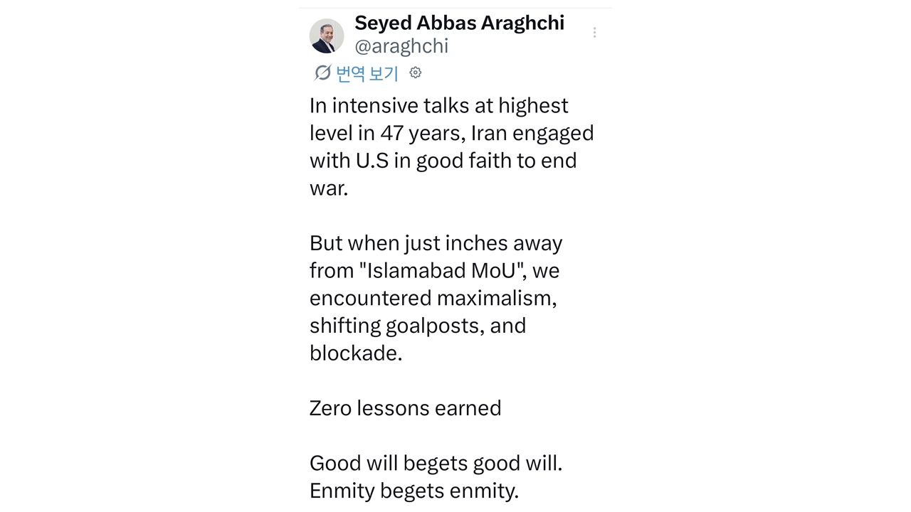 협상에 참석했던 아라그치 장관은 오늘(13일) 소셜미디어 올린 글에서 "47년 만에 열린 미국과의 최고위급 집중 협상에서 이란은 전쟁을 끝내기 위해 선의로 임했다"며 "그러나 '이슬라마바드 양해각서(MOU)'를 목전에 두고 우린 극단주의적 태도, 말 바꾸기, 봉쇄에 부딪혔다"고 밝혔습니다.