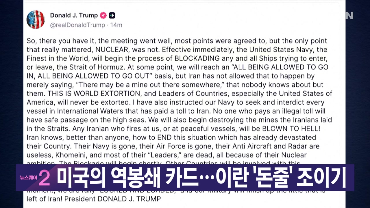 ■ 이란과의 종전 협상을 빈손으로 끝낸 미국이 우리시각 오늘 밤 11시부터 이란을 드나드는 모든 선박을 봉쇄하겠다고 밝혔습니다. 이란의 돈줄을 조여 최대 압박에 나서겠다는 의도로 풀이됩니다.