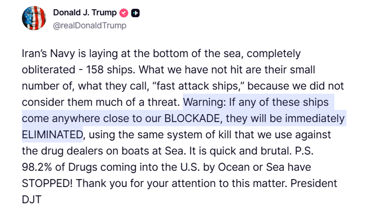 미군이 호르무즈 해협 일대를 봉쇄한 가운데 트럼프 대통령은 이란 선박이 한 척이라도 봉쇄선 근처에 접근하면 즉각 제거할 것이라고 경고했습니다.