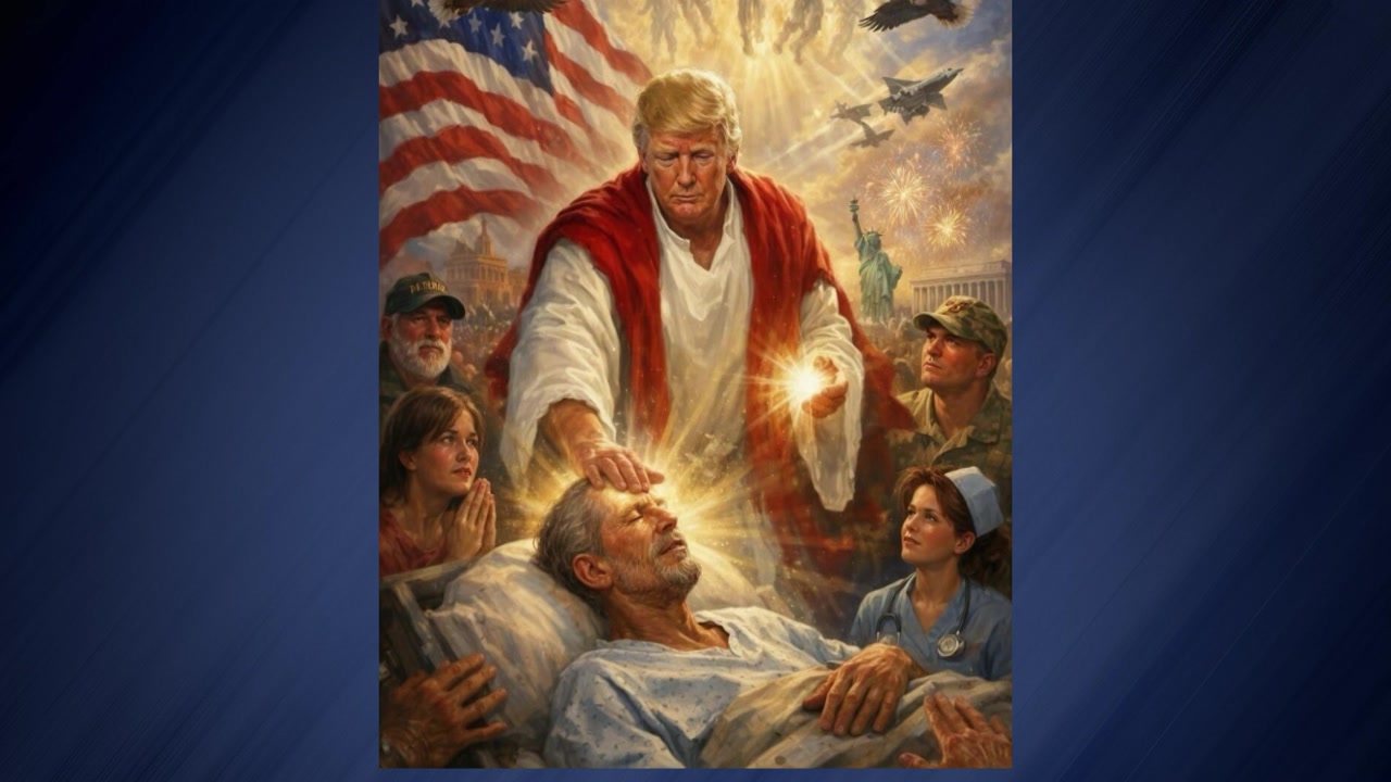 예수의 모습을 한 트럼프 대통령이 환자를 치유하는 '구원자'처럼 표현됐고, 주변에는 미군과 성조기, 천사 등이 배치됐는데요,
