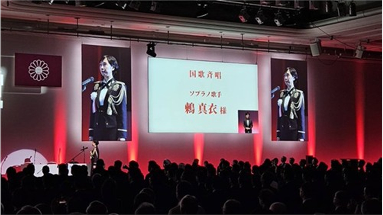 교도통신과 아사히 신문 등 현지 언론에 따르면 지난 12일 열린 자민당 당 대회에서 육상 자위대 중앙 음악대 소속 쓰구미 마이 3등육조가 무대에 올라 일본 국가를 불렀습니다.