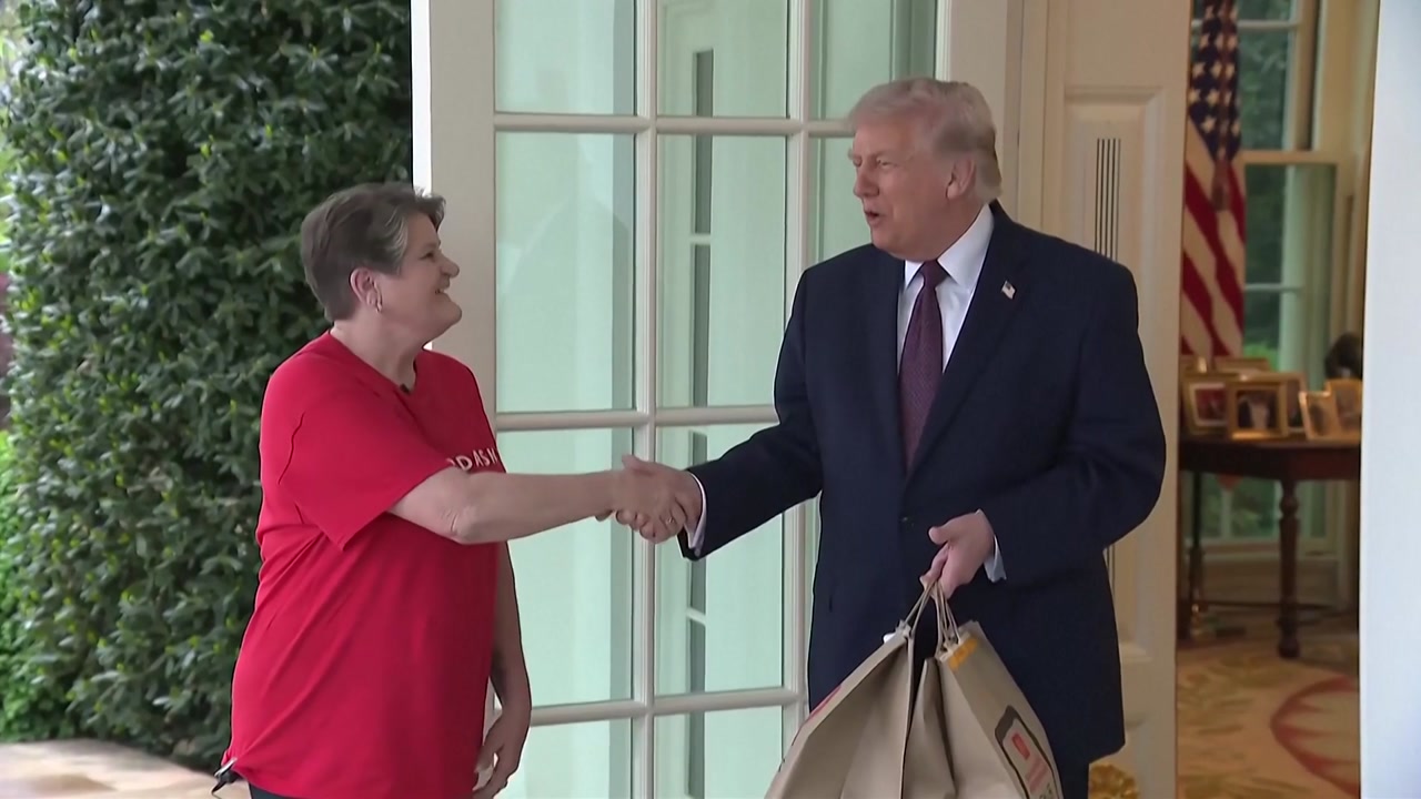 트럼프 대통령은 현지시간 13일, 백악관으로 맥도날드 음식을 가져온 배달 기사 샤론 시먼스 씨에게 즉석 회견을 제안했으며, 이 과정에서 주머니에 있던 100달러 지폐를 팁으로 직접 건넸습니다.