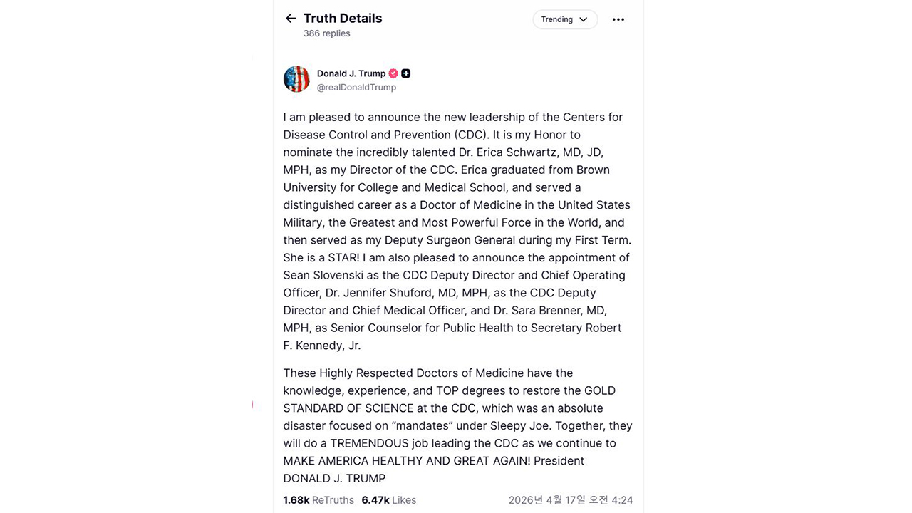 트럼프 대통령은 이날 소셜미디어에서 "탁월한 역량을 갖춘 에리카 슈워츠 박사를 CDC 국장으로 지명하게 돼 영광으로 생각한다"며 "그녀는 스타"라고 밝혔습니다.