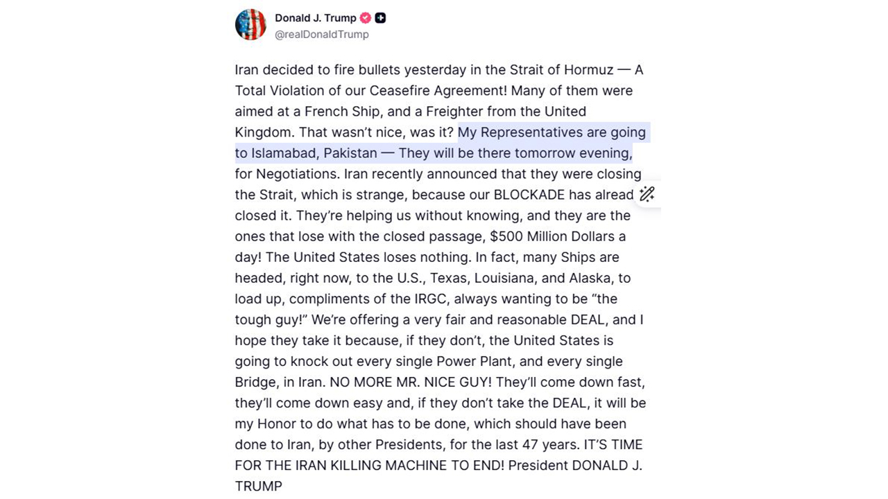 트럼프 대통령은 조금 전 자신의 SNS를 통해 미국 대표단이 협상을 위해 미국 동부 시간 기준으로 내일 저녁 파키스탄 수도 이슬라마바드에 도착할 예정이라고 밝혔습니다.