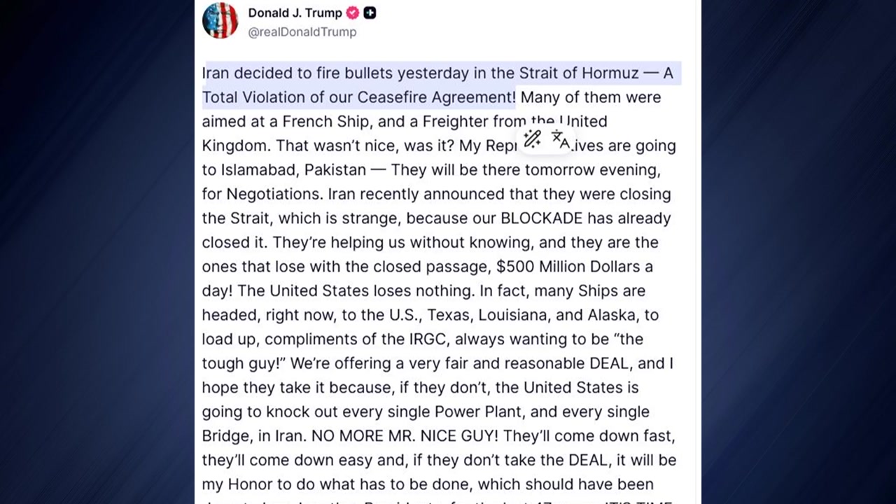 도널드 트럼프 미국 대통령은 이란과 협상을 위해 파키스탄에 협상단을 보냈다며 이란이 합의하지 않으면 핵심 인프라 시설을 파괴하겠다고 위협했습니다.
